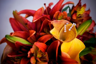 The colors are wonderful! Orange and yellow with a touch of white! I love the photo below that shows the flower petals scattered on the law, you can really see the wonderful way the colors worked together along with the neutral colors in the bride's maid's dresses!